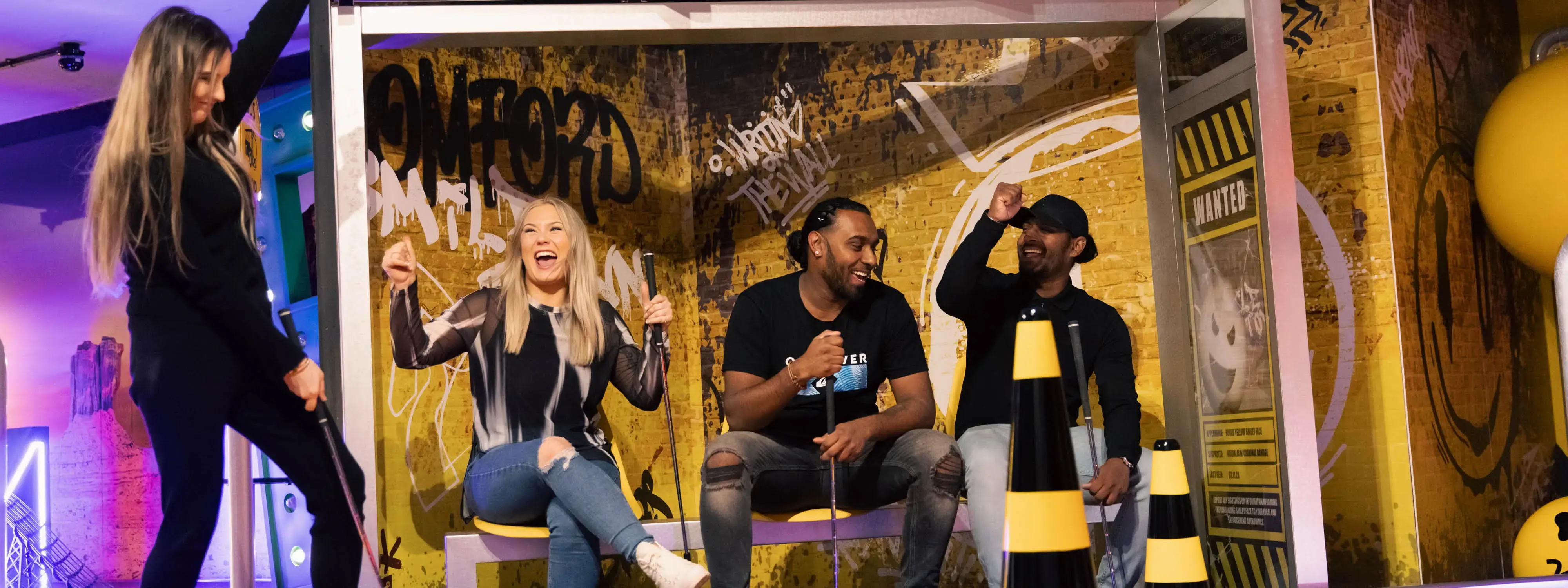 Grab your putters and your scorecards, it’s time to take on the craziest crazy golf ever! Mulligans Romford has two epic 12-hole crazy golf courses, choose you’re favourite or play them both! From par-tee-ing in studio 54 and exploring a neon junkyard to falling through black holes or seeing red in the queen of hearts court, there’s plenty of challenges for you to take a swing at!